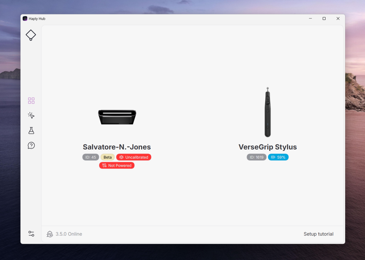 Ihre Geräte werden nun in der Geräteübersicht des Haply angezeigt. Sollte dies nicht der Fall sein, gehen Sie zum Abschnitt „Fehlerbehebung“ oder wenden Sie sich an Haply .