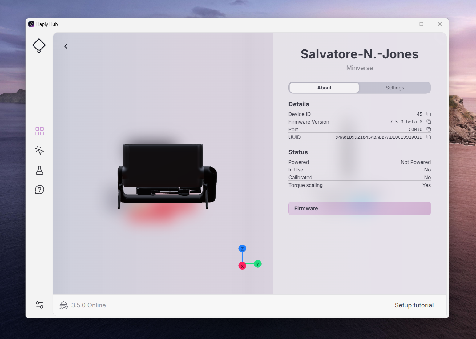 Auf der Registerkarte „Einstellungen“ des Haply können Sie überprüfen, welche Version des Hubs installiert ist und welche Version des Dienstes ausgeführt wird.